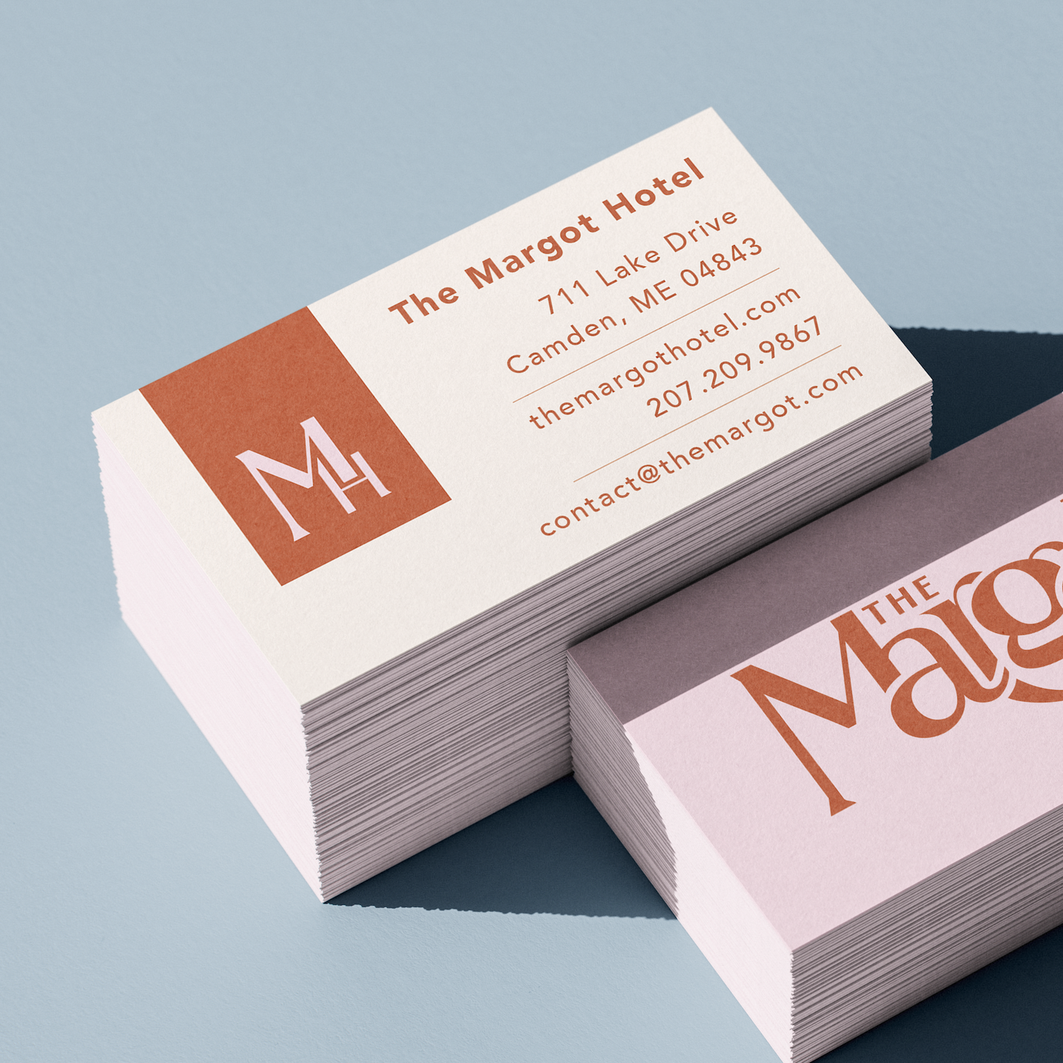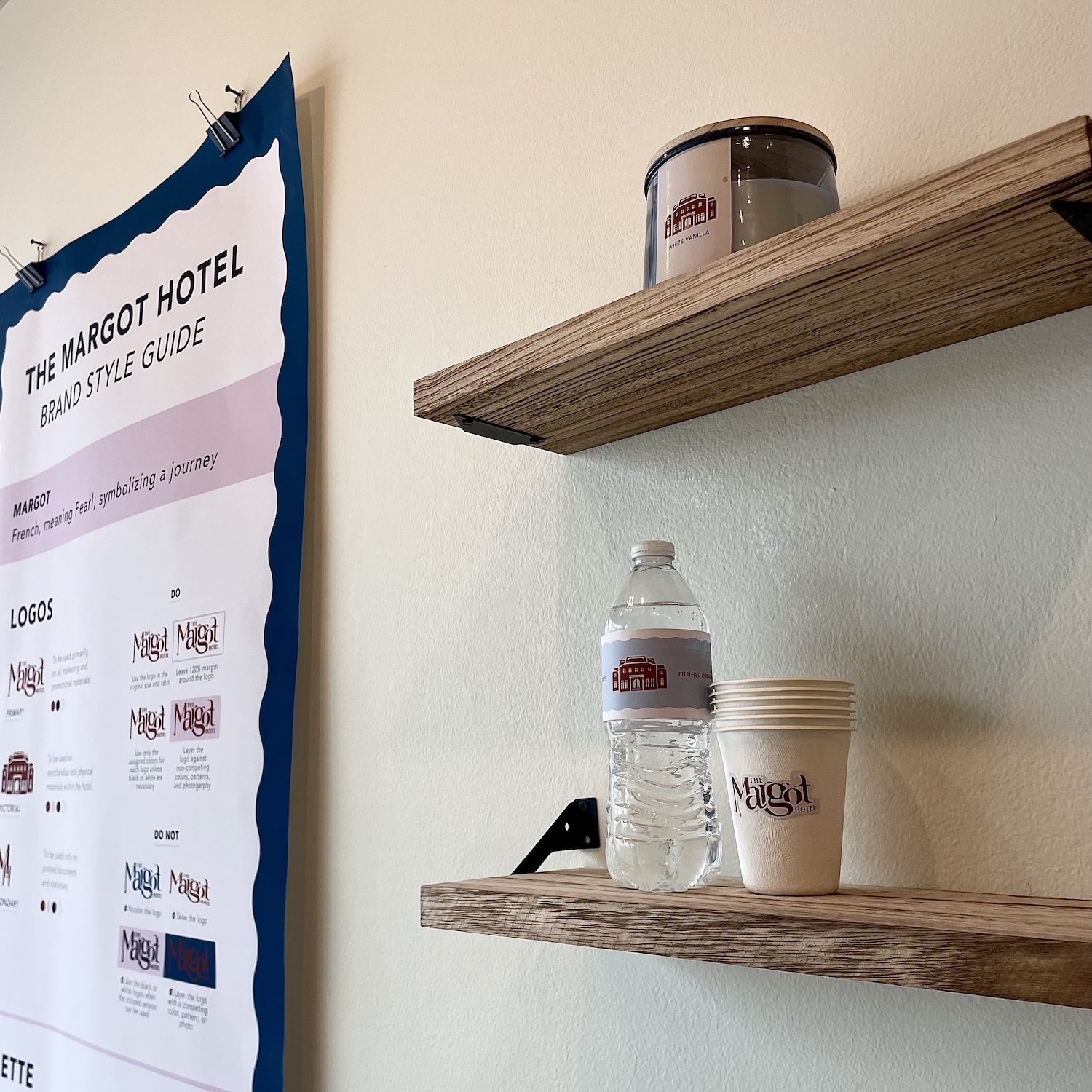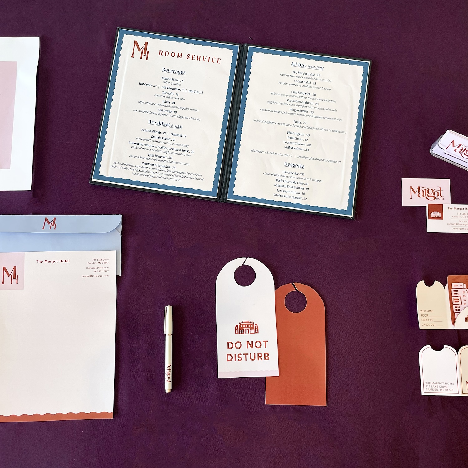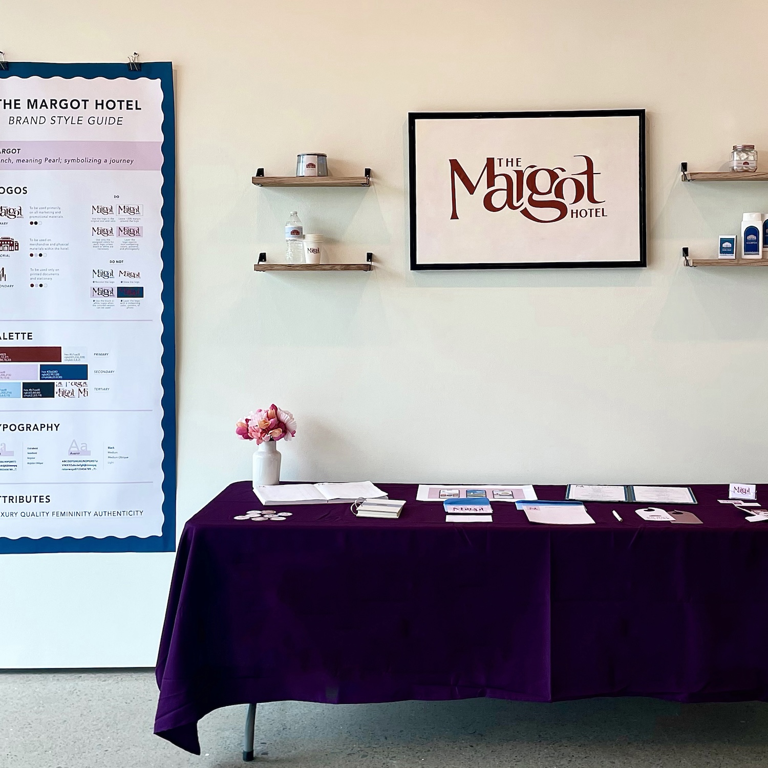 For my senior capstone project I focused on corporate branding in designing a brand identity and suite of products for a fictitious hotel, The Margot. The Margot is a coastal hotel that delivers luxury and quality with a vintage feminine aesthetic. This project was displayed in the Harlan Gallery at Seton Hill University.